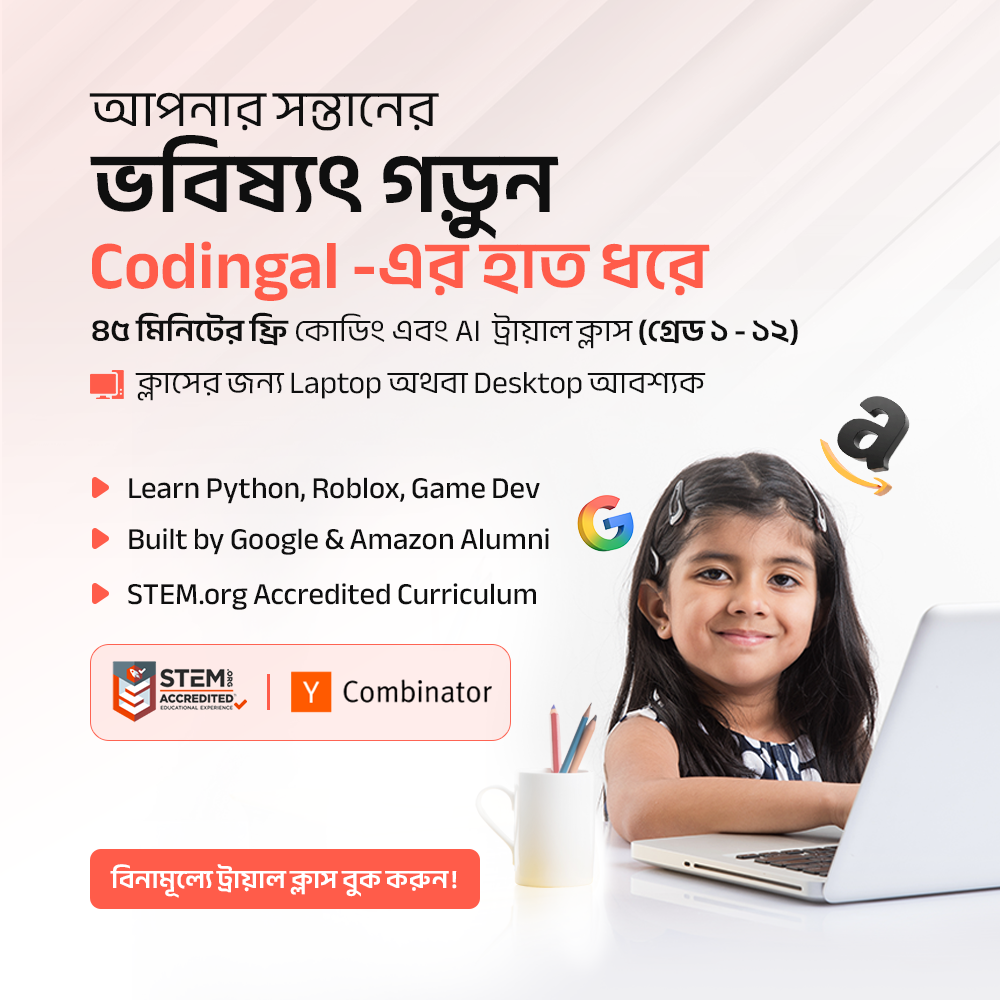 একবিংশ শতাব্দীতে কোডিং কেবল একটি টেকনিক্যাল স্কিল নয়, এটি ভবিষ্যতের ভাষা। আপনার সন্তানকে আগামীর পৃথিবীর জন্য প্রস্তুত করতে এবং তাদের লজিক্যাল চিন্তাশক্তি বৃদ্ধি করতে 'প্রযুক্তি টিম' গর্বের সাথে নিয়ে এসেছে বিশ্বের অন্যতম জনপ্রিয় কোডিং প্ল্যাটফর্ম 'Codingal'-এর সাথে বিশেষ পার্টনারশিপ।